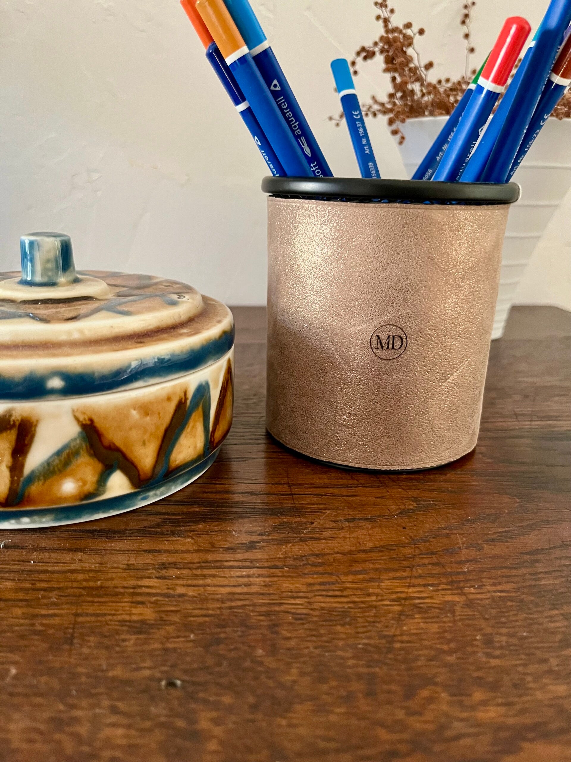 Gainage cuir sur pot métallique